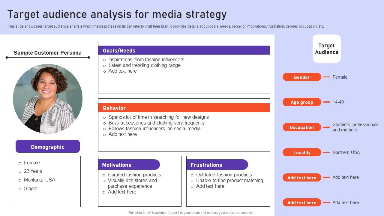 This slide showcases target audience analysis which media professionals can refer to craft their plan. It provides details about goals, needs, behavior, motivations, frustration, gender, occupation, etc. Retrieve professionally designed Target Audience Analysis For Media Strategy Ppt PowerPoint Presentation File Example PDF to effectively convey your message and captivate your listeners. Save time by selecting pre made slideshows that are appropriate for various topics, from business to educational purposes. These themes come in many different styles, from creative to corporate, and all of them are easily adjustable and can be edited quickly. Access them as PowerPoint templates or as Google Slides themes. You do not have to go on a hunt for the perfect presentation because Slidegeeks got you covered from everywhere.