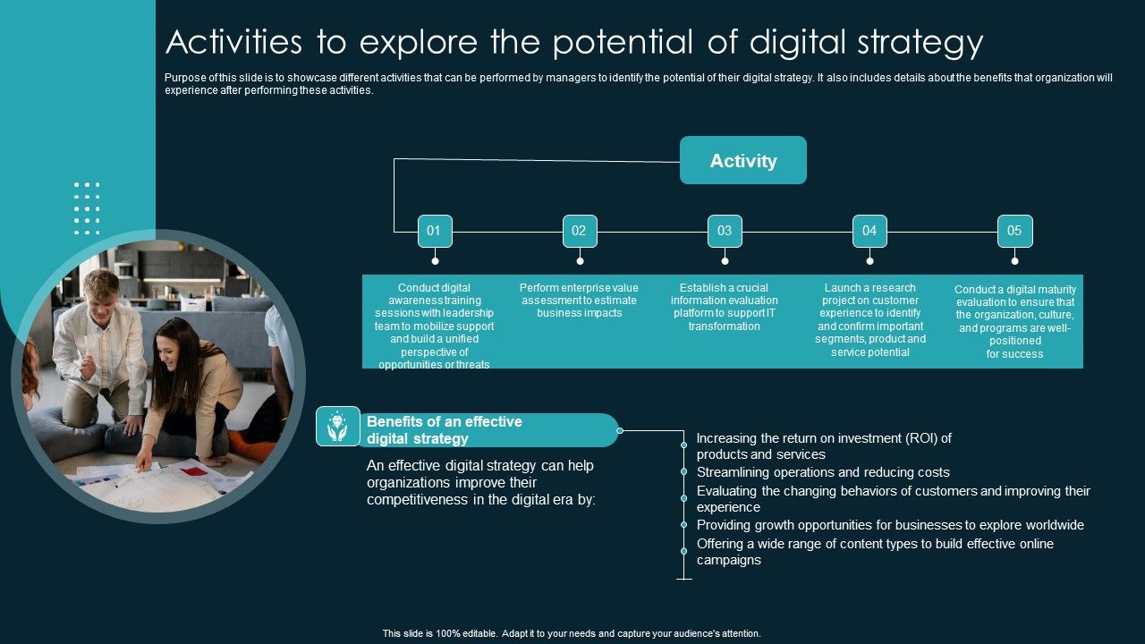 Purpose of this slide is to showcase different activities that can be performed by managers to identify the potential of their digital strategy. It also includes details about the benefits that organization will experience after performing these activities. Boost your pitch with our creative Activities To Explore The Potential Of Digital Strategy Topics PDF. Deliver an awe inspiring pitch that will mesmerize everyone. Using these presentation templates you will surely catch everyones attention. You can browse the ppts collection on our website. We have researchers who are experts at creating the right content for the templates. So you do not have to invest time in any additional work. Just grab the template now and use them.