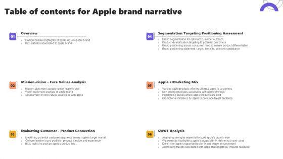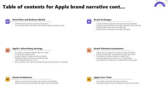 Retrieve professionally designed Table Of Contents For Apple Brand Narrative Ppt Model Show PDF to effectively convey your message and captivate your listeners. Save time by selecting pre made slideshows that are appropriate for various topics, from business to educational purposes. These themes come in many different styles, from creative to corporate, and all of them are easily adjustable and can be edited quickly. Access them as PowerPoint templates or as Google Slides themes. You do not have to go on a hunt for the perfect presentation because Slidegeeks got you covered from everywhere.