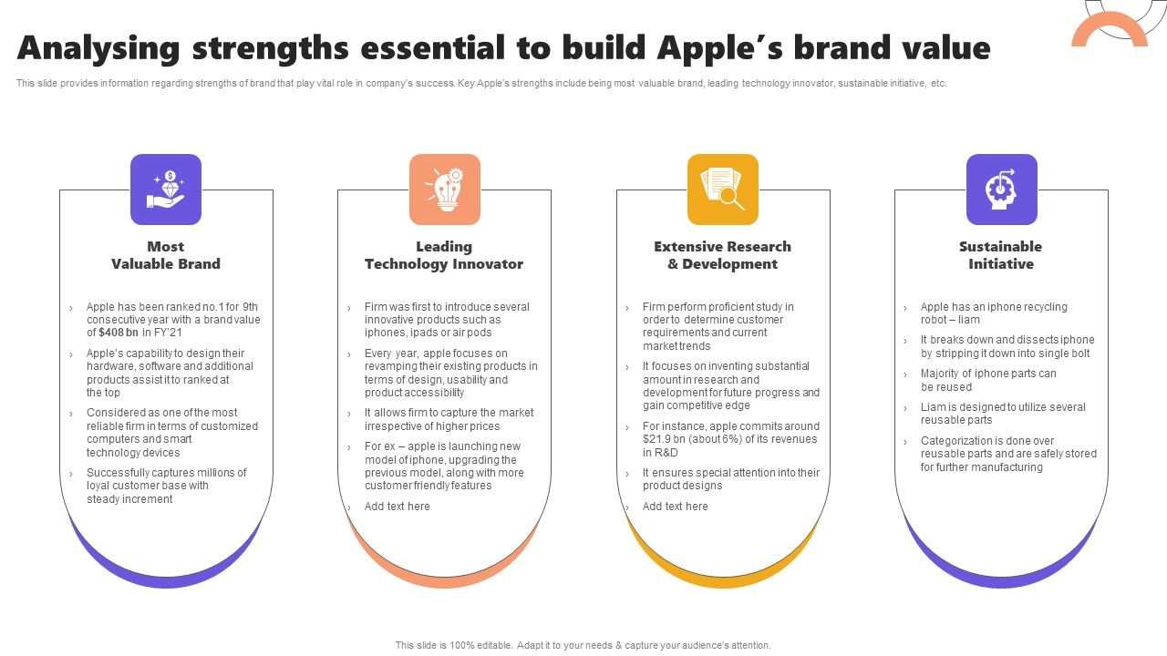 This slide provides information regarding strengths of brand that play vital role in companys success. Key Apples strengths include being most valuable brand, leading technology innovator, sustainable initiative, etc. Are you in need of a template that can accommodate all of your creative concepts This one is crafted professionally and can be altered to fit any style. Use it with Google Slides or PowerPoint. Include striking photographs, symbols, depictions, and other visuals. Fill, move around, or remove text boxes as desired. Test out color palettes and font mixtures. Edit and save your work, or work with colleagues. Download Analysing Strengths Essential To Build Apples Brand Value Ppt Images PDF and observe how to make your presentation outstanding. Give an impeccable presentation to your group and make your presentation unforgettable.