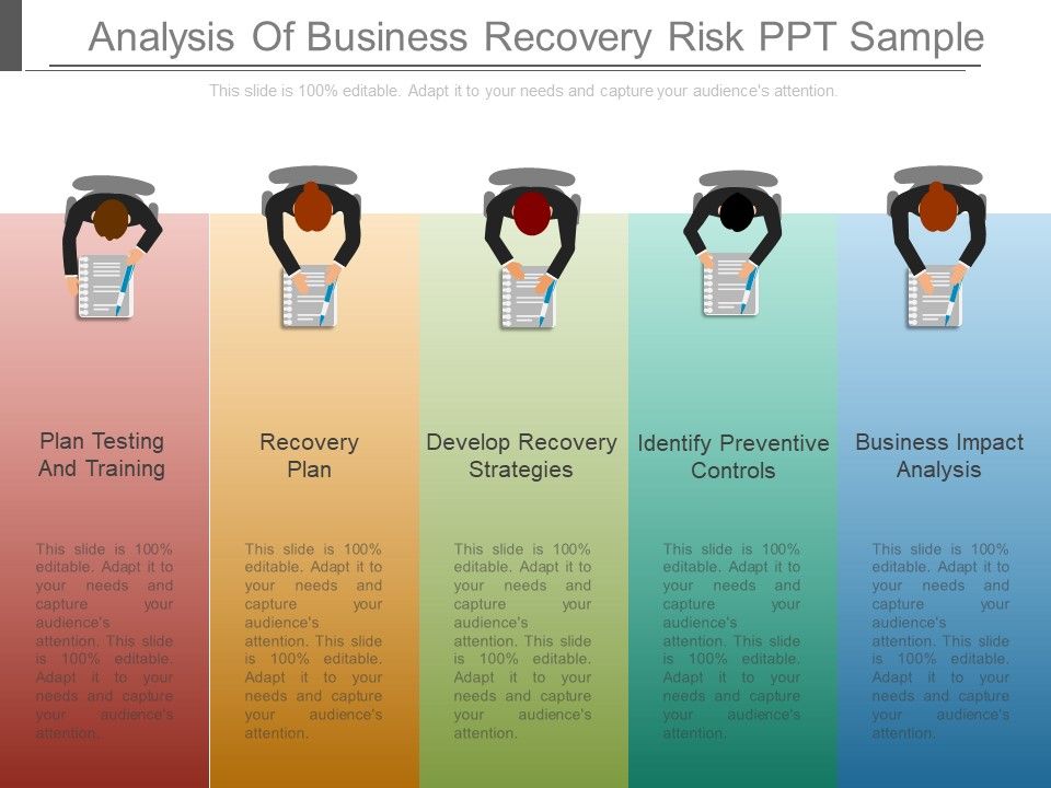 This is a analysis of business recovery risk ppt sample. This is a five stage process. The stages in this process are plan testing and training, recovery plan, develop recovery strategies, identify preventive controls, business impact analysis.