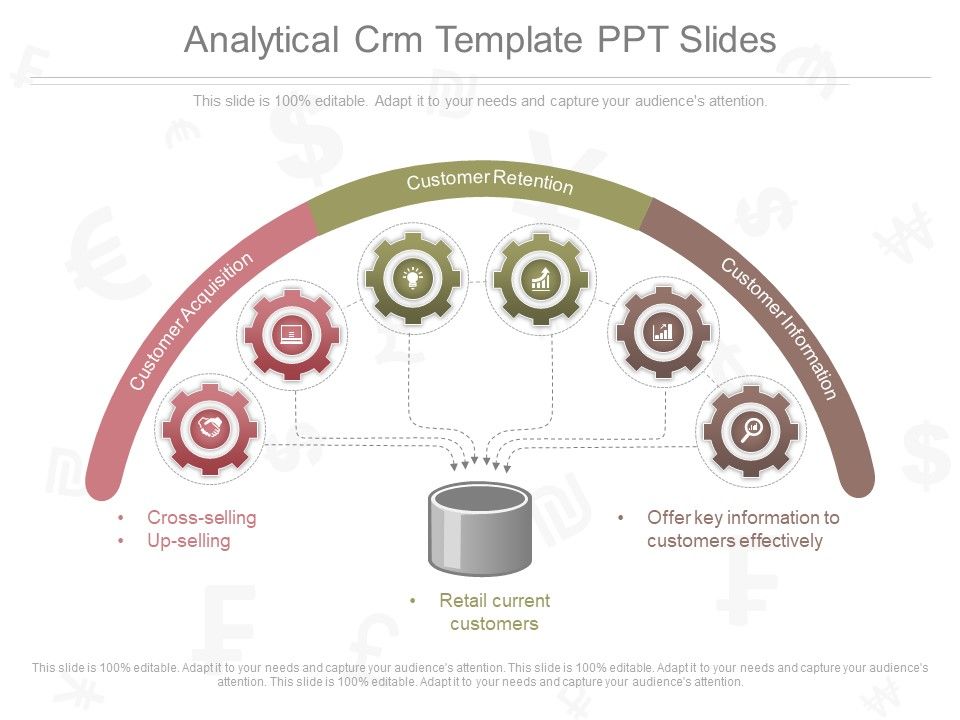 This is a analytical crm template ppt slides. This is a three stage process. The stages in this process are customer acquisition, customer retention, customer information, cross selling, up selling, retail current customers, offer key information to customers effectively.