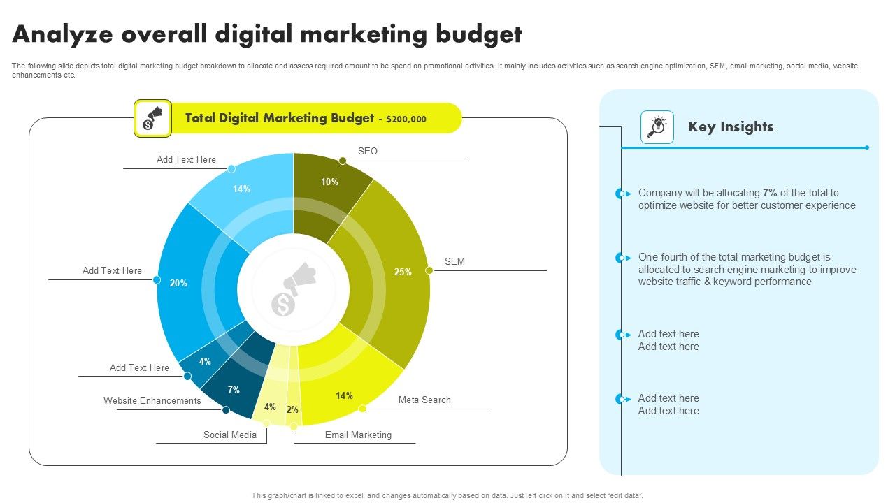 The following slide depicts total digital marketing budget breakdown to allocate and assess required amount to be spend on promotional activities. It mainly includes activities such as search engine optimization, SEM, email marketing, social media, website enhancements etc. If you are looking for a format to display your unique thoughts, then the professionally designed Analyze Overall Digital Marketing Budget Ppt Show Aids PDF is the one for you. You can use it as a Google Slides template or a PowerPoint template. Incorporate impressive visuals, symbols, images, and other charts. Modify or reorganize the text boxes as you desire. Experiment with shade schemes and font pairings. Alter, share or cooperate with other people on your work. Download Analyze Overall Digital Marketing Budget Ppt Show Aids PDF and find out how to give a successful presentation. Present a perfect display to your team and make your presentation unforgettable.