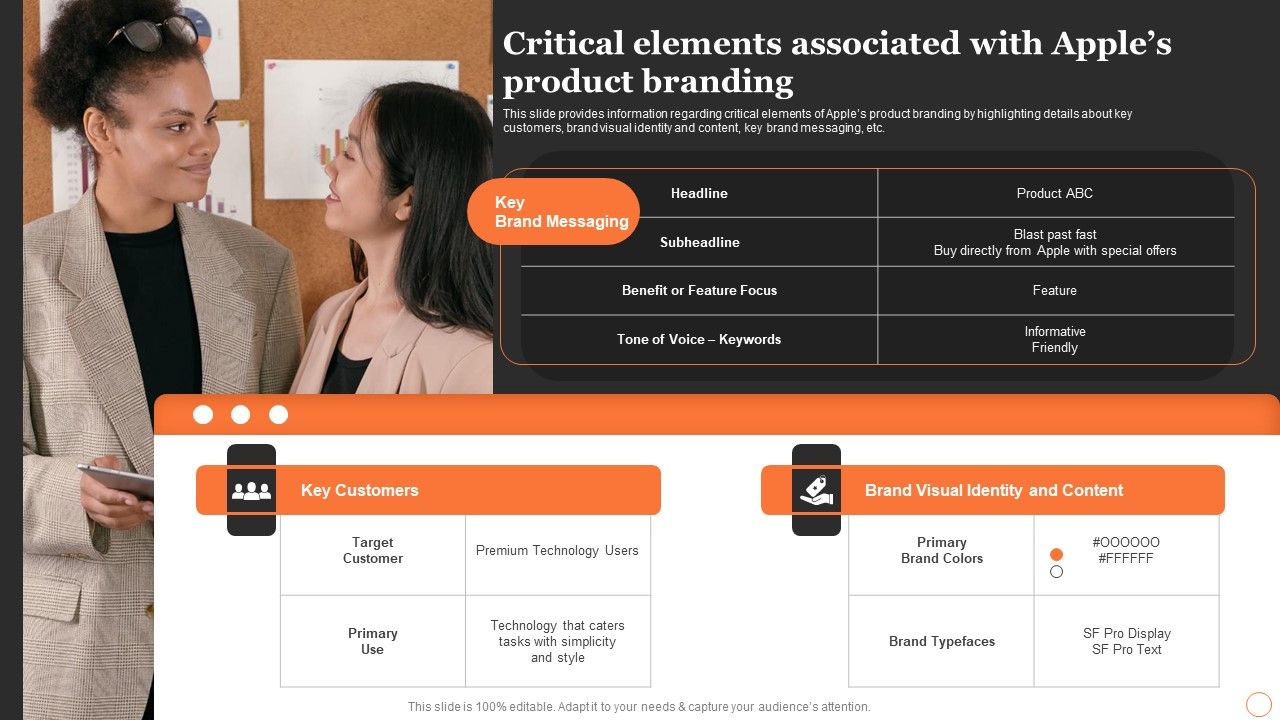 This slide provides information regarding critical elements of Apples product branding by highlighting details about key customers, brand visual identity and content, key brand messaging, etc. If your project calls for a presentation, then Slidegeeks is your go to partner because we have professionally designed, easy to edit templates that are perfect for any presentation. After downloading, you can easily edit Apples Strategy To Achieve Top Brand Value Position Critical Elements Associated With Apples Product Branding Formats PDF and make the changes accordingly. You can rearrange slides or fill them with different images. Check out all the handy templates