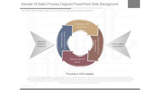 This is a sample of sales process diagram powerpoint slide background. This is a four stage process. The stages in this process are attracting qualified prospects, understanding prospects needs, follow up with prospects, always ask for close, addressing prospects needs, unique selling proposition.