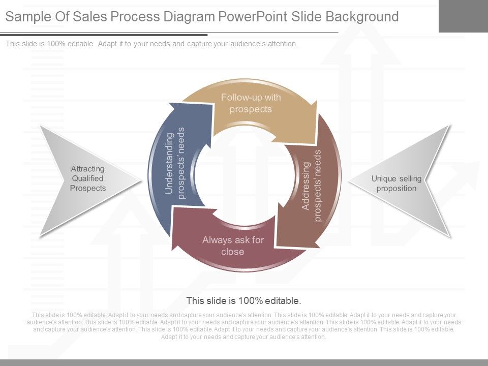 This is a sample of sales process diagram powerpoint slide background. This is a four stage process. The stages in this process are attracting qualified prospects, understanding prospects needs, follow up with prospects, always ask for close, addressing prospects needs, unique selling proposition.