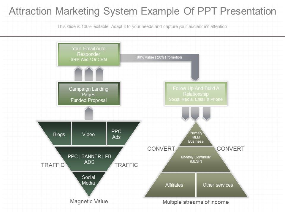This is a attraction marketing system example of ppt presentation. This is a one stage process. The stages in this process are your email auto responder srm and or crm, campaign landing pages funded proposal, blogs, video, ppc ads, ppc banner fb ads, social media, follow up and build a relationship social media, email and phone, primary mlm business, monthly continuity mlsp, affiliates, other services, traffic, magnetic value, multiple streams of income.\n\n\n