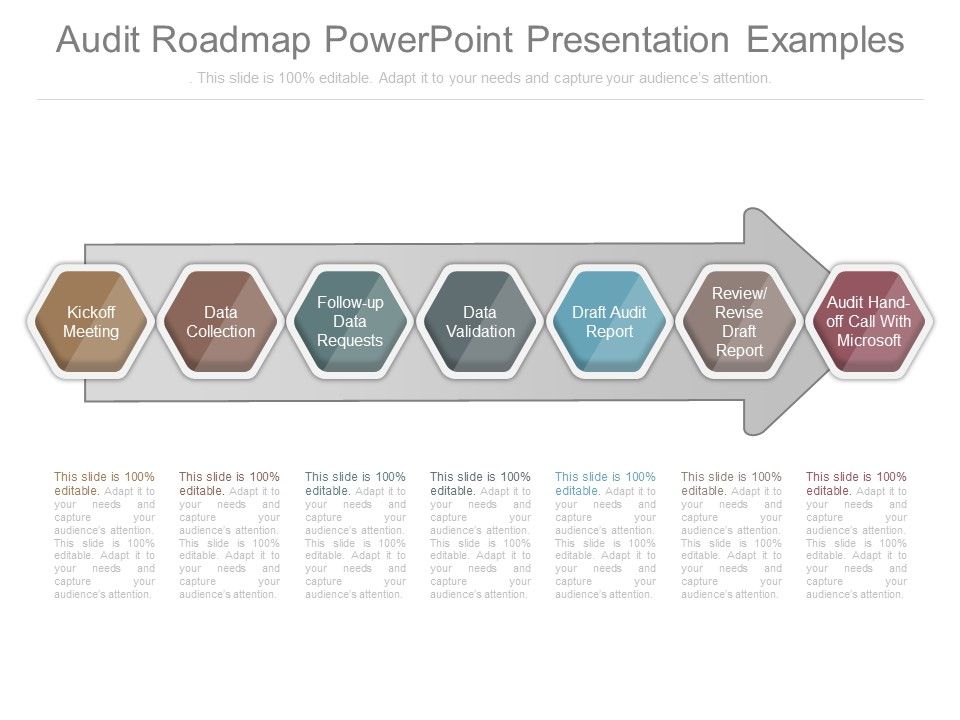 This is a audit roadmap powerpoint presentation examples. This is a seven stage process. The stages in this process are kickoff meeting, data collection, follow up data requests, data validation, draft audit report, review revise draft report, audit hand off call with microsoft.