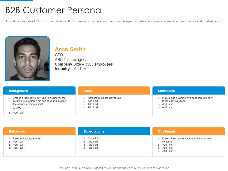 Presenting b2b customer persona ideas pdf to provide visual cues and insights. Share and navigate important information on one stage that need your due attention. This template can be used to pitch topics like b2b customer persona. In addtion, this PPT design contains high resolution images, graphics, etc, that are easily editable and available for immediate download.