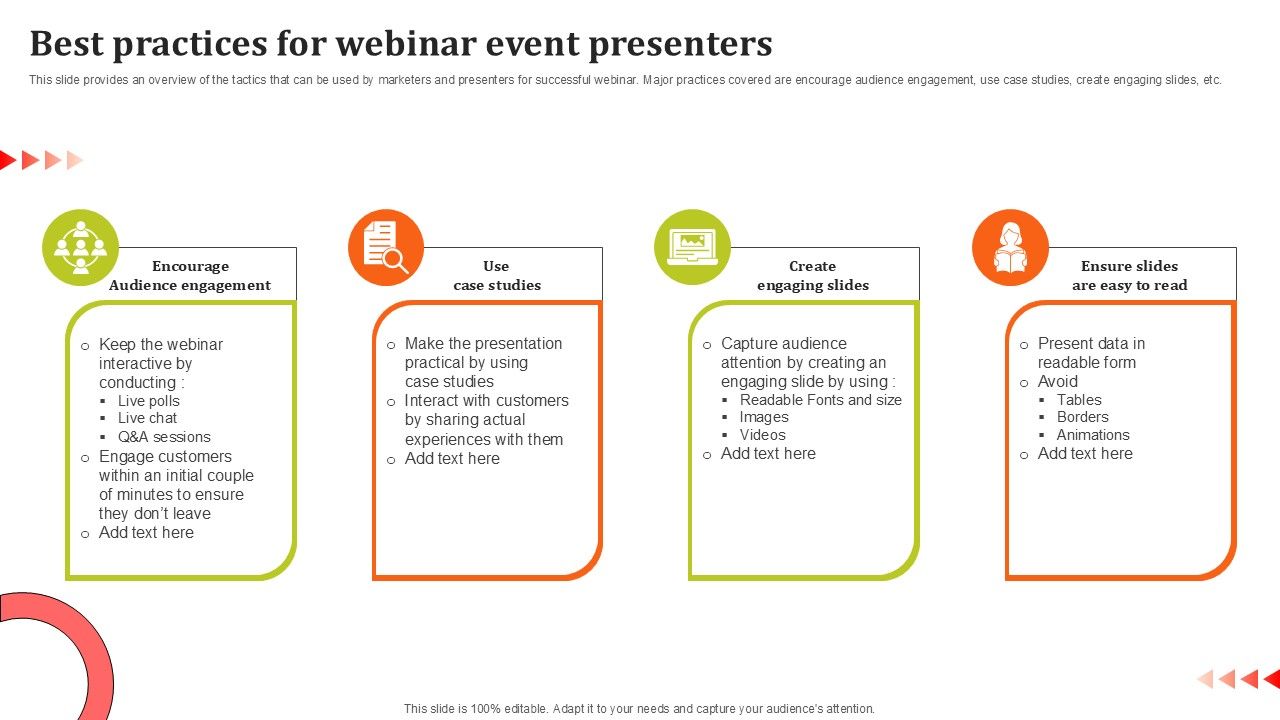 This slide provides an overview of the tactics that can be used by marketers and presenters for successful webinar. Major practices covered are encourage audience engagement, use case studies, create engaging slides, etc. Make sure to capture your audiences attention in your business displays with our gratis customizable Best Practices For Webinar Event Presenters Ppt Model Clipart PDF. These are great for business strategies, office conferences, capital raising or task suggestions. If you desire to acquire more customers for your tech business and ensure they stay satisfied, create your own sales presentation with these plain slides.
