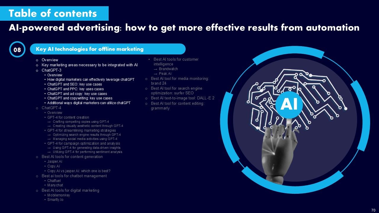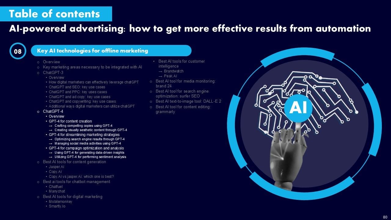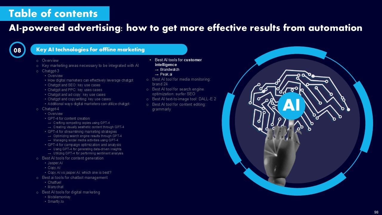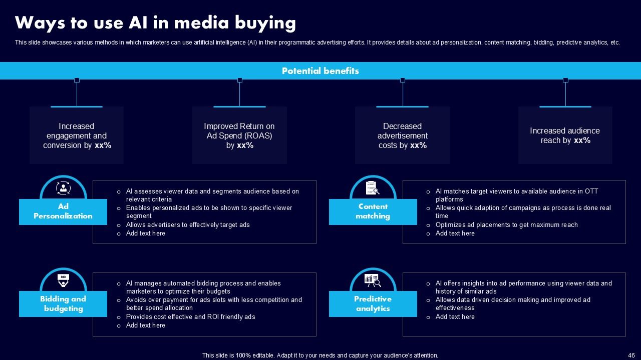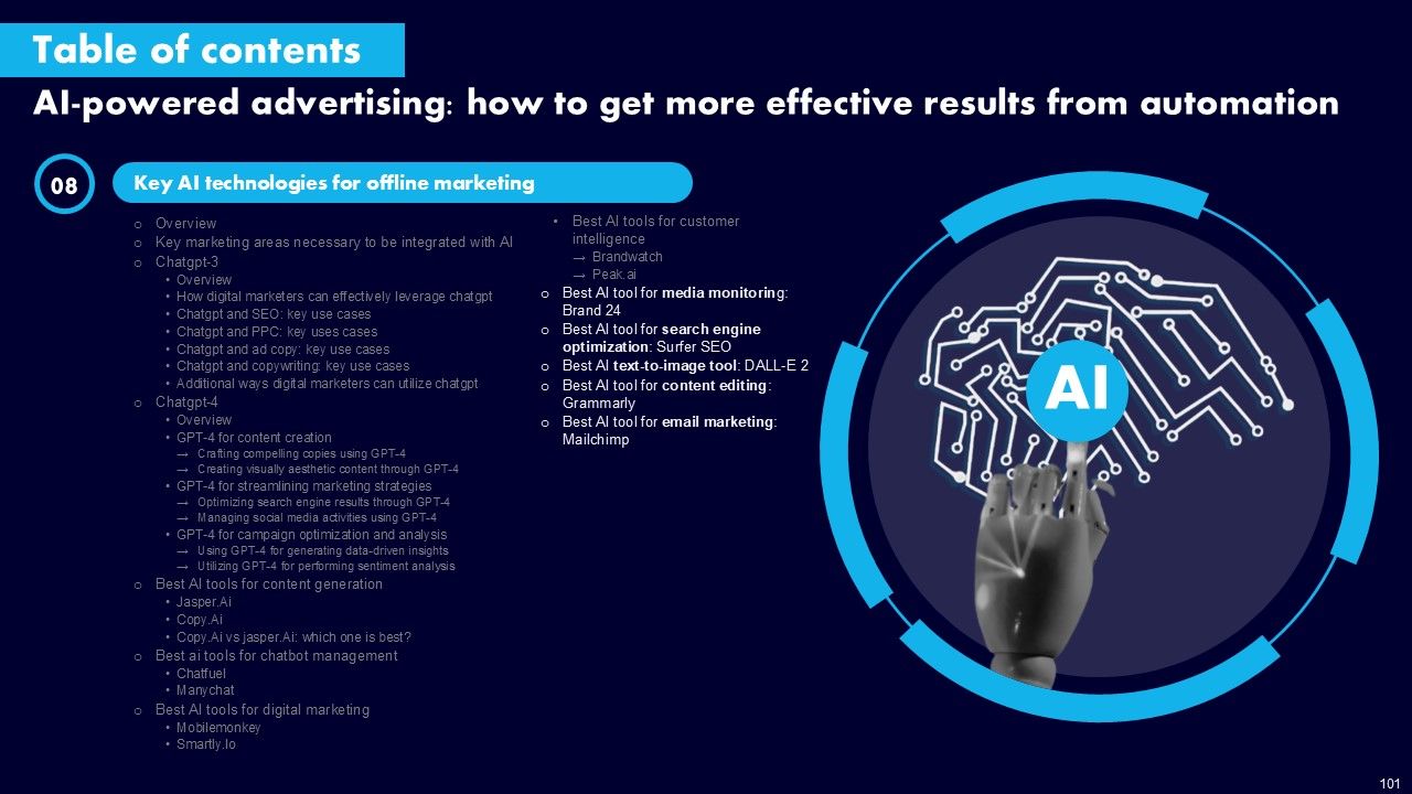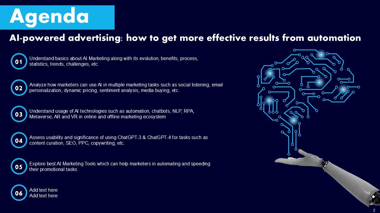 This AI Powered Advertising How To Get More Effective Results From Automation Ppt PowerPoint Presentation Complete Deck With Slides is a primer on how to capitalize on business opportunities through planning, innovation, and market intelligence. The content-ready format of the complete deck will make your job as a decision-maker a lot easier. Use this ready-made PowerPoint Template to help you outline an extensive and legible plan to capture markets and grow your company on the right path, at an exponential pace. What is even more amazing is that this presentation is completely editable and 100 percent customizable. This one hundred ninteen slide complete deck helps you impress a roomful of people with your expertise in business and even presentation. Craft such a professional and appealing presentation for that amazing recall value. Download now.