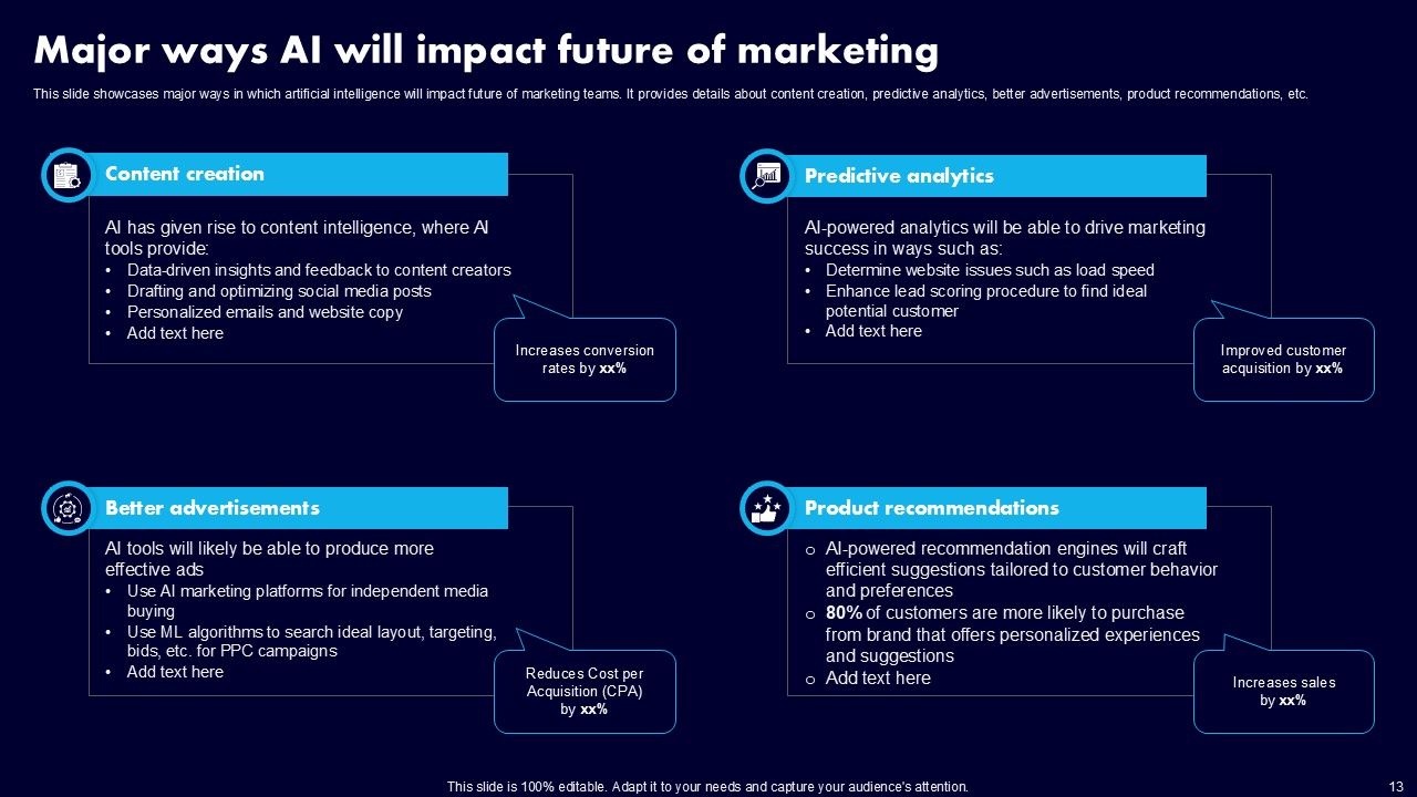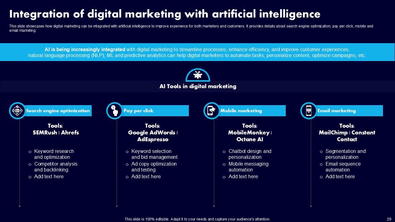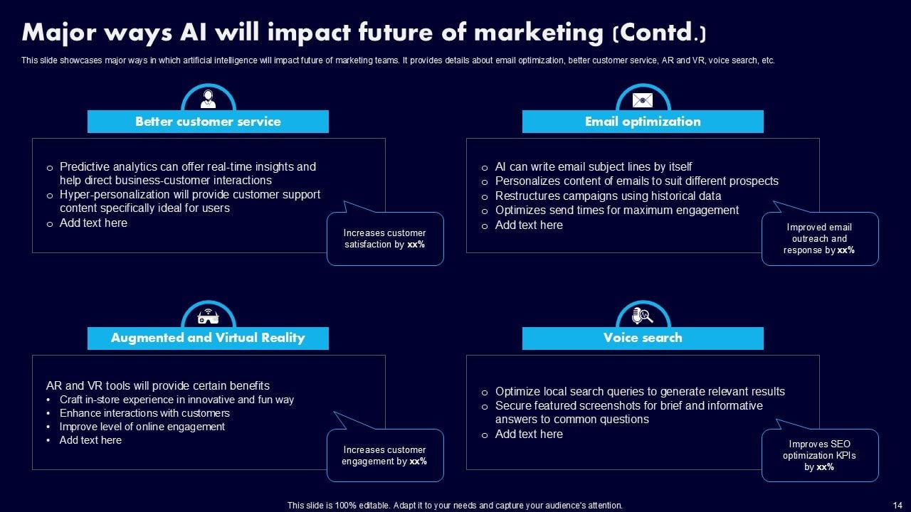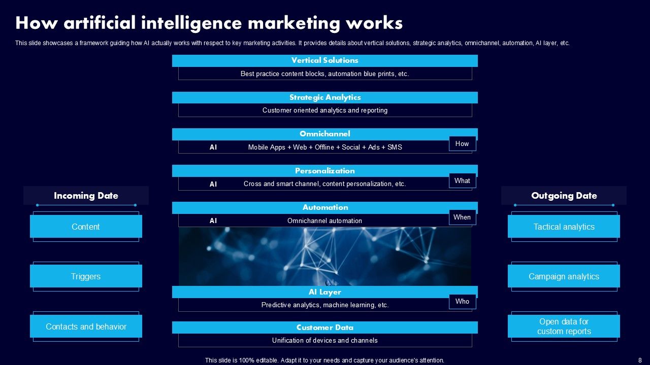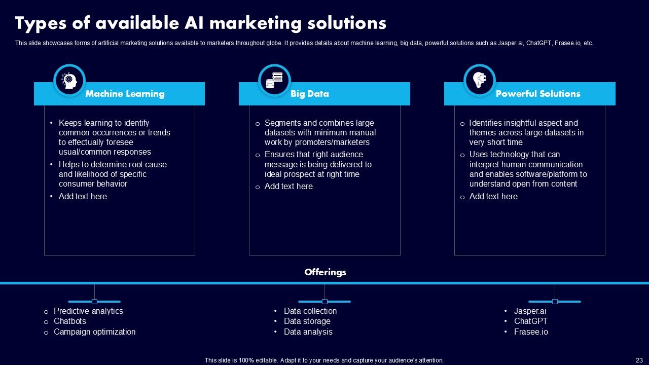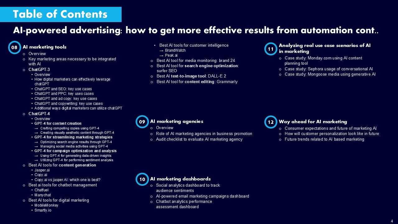 This AI Powered Advertising How To Get More Effective Results From Automation Ppt PowerPoint Presentation Complete Deck With Slides is a primer on how to capitalize on business opportunities through planning, innovation, and market intelligence. The content-ready format of the complete deck will make your job as a decision-maker a lot easier. Use this ready-made PowerPoint Template to help you outline an extensive and legible plan to capture markets and grow your company on the right path, at an exponential pace. What is even more amazing is that this presentation is completely editable and 100 percent customizable. This one hundred ninteen slide complete deck helps you impress a roomful of people with your expertise in business and even presentation. Craft such a professional and appealing presentation for that amazing recall value. Download now.