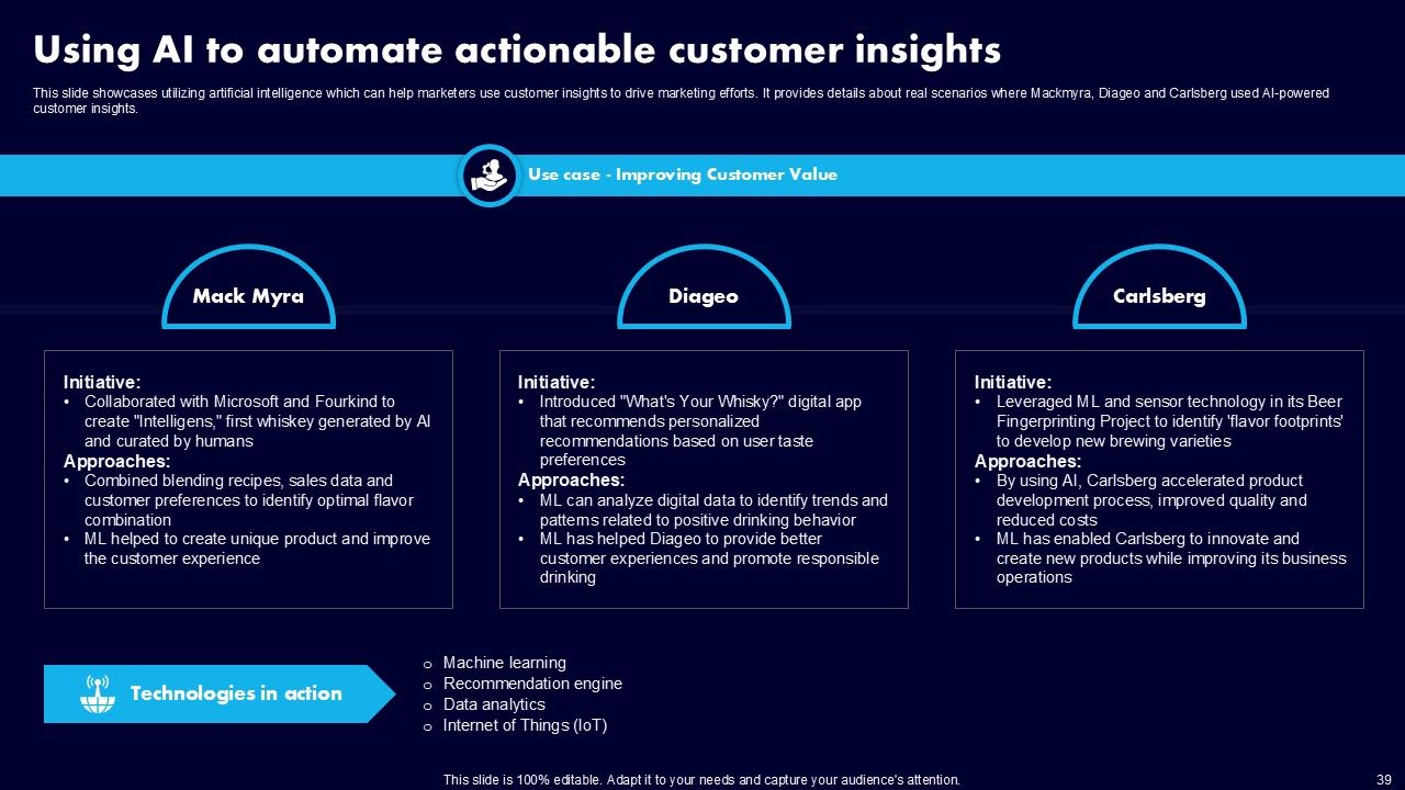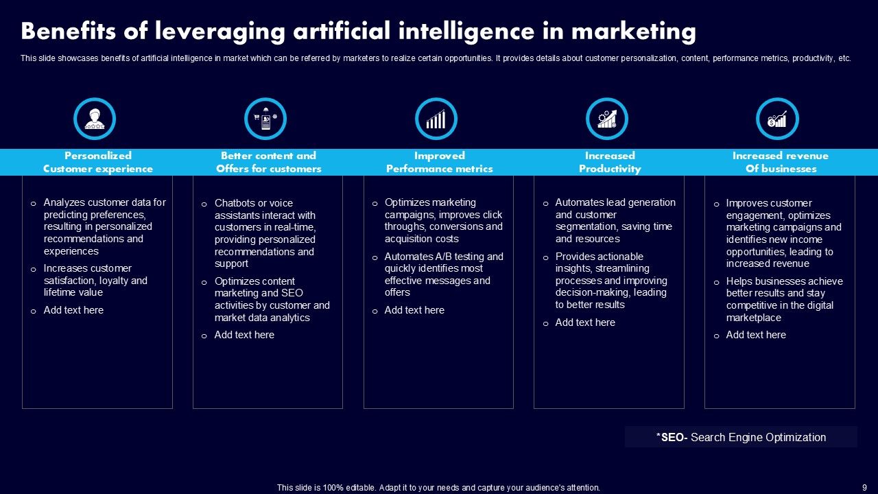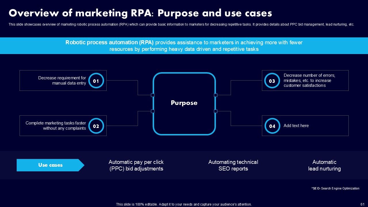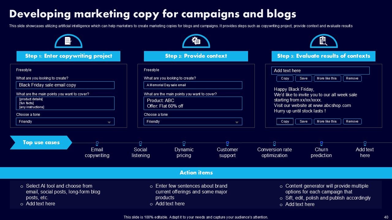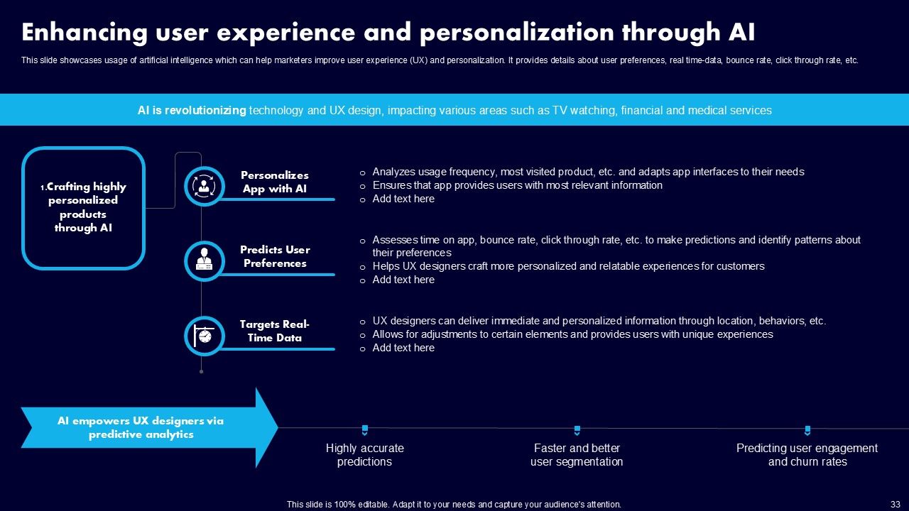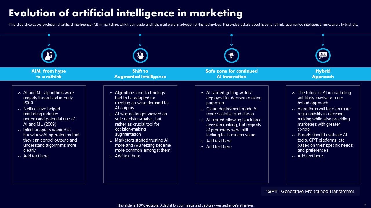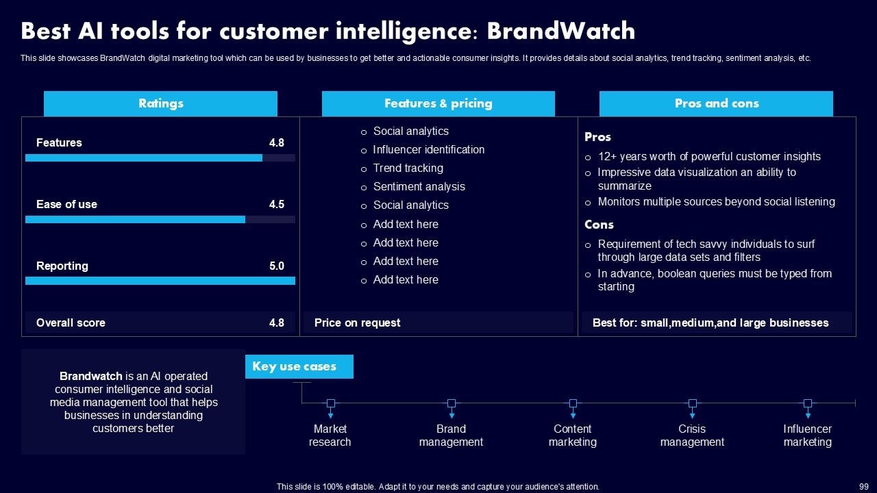 This AI Powered Advertising How To Get More Effective Results From Automation Ppt PowerPoint Presentation Complete Deck With Slides is a primer on how to capitalize on business opportunities through planning, innovation, and market intelligence. The content-ready format of the complete deck will make your job as a decision-maker a lot easier. Use this ready-made PowerPoint Template to help you outline an extensive and legible plan to capture markets and grow your company on the right path, at an exponential pace. What is even more amazing is that this presentation is completely editable and 100 percent customizable. This one hundred ninteen slide complete deck helps you impress a roomful of people with your expertise in business and even presentation. Craft such a professional and appealing presentation for that amazing recall value. Download now.