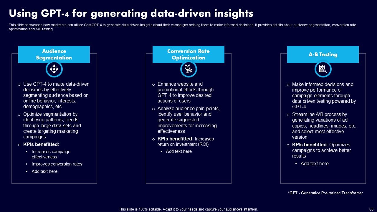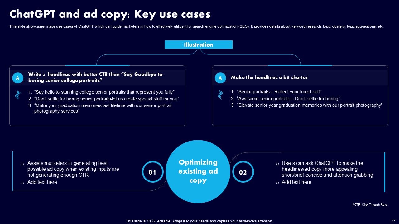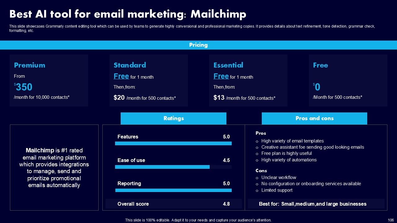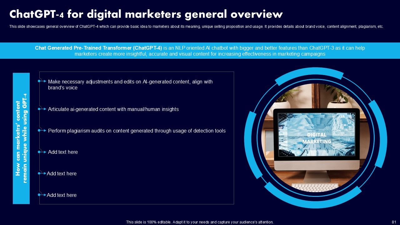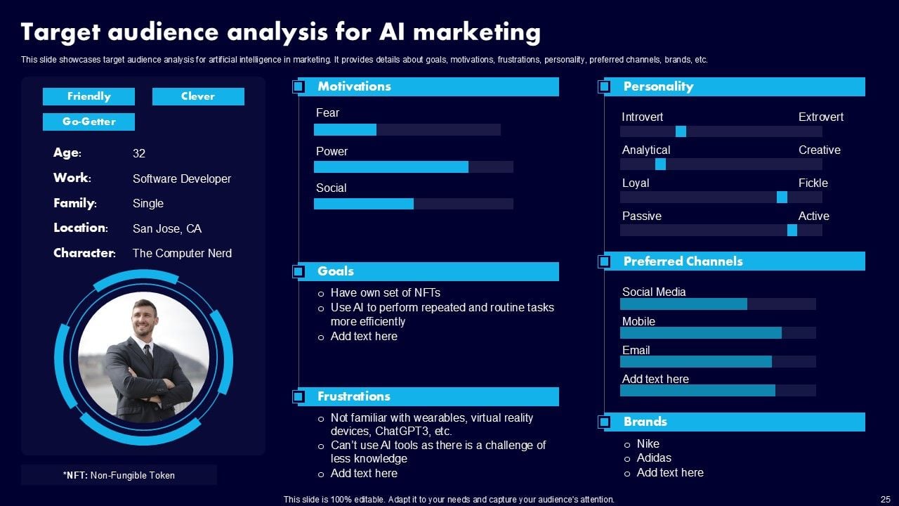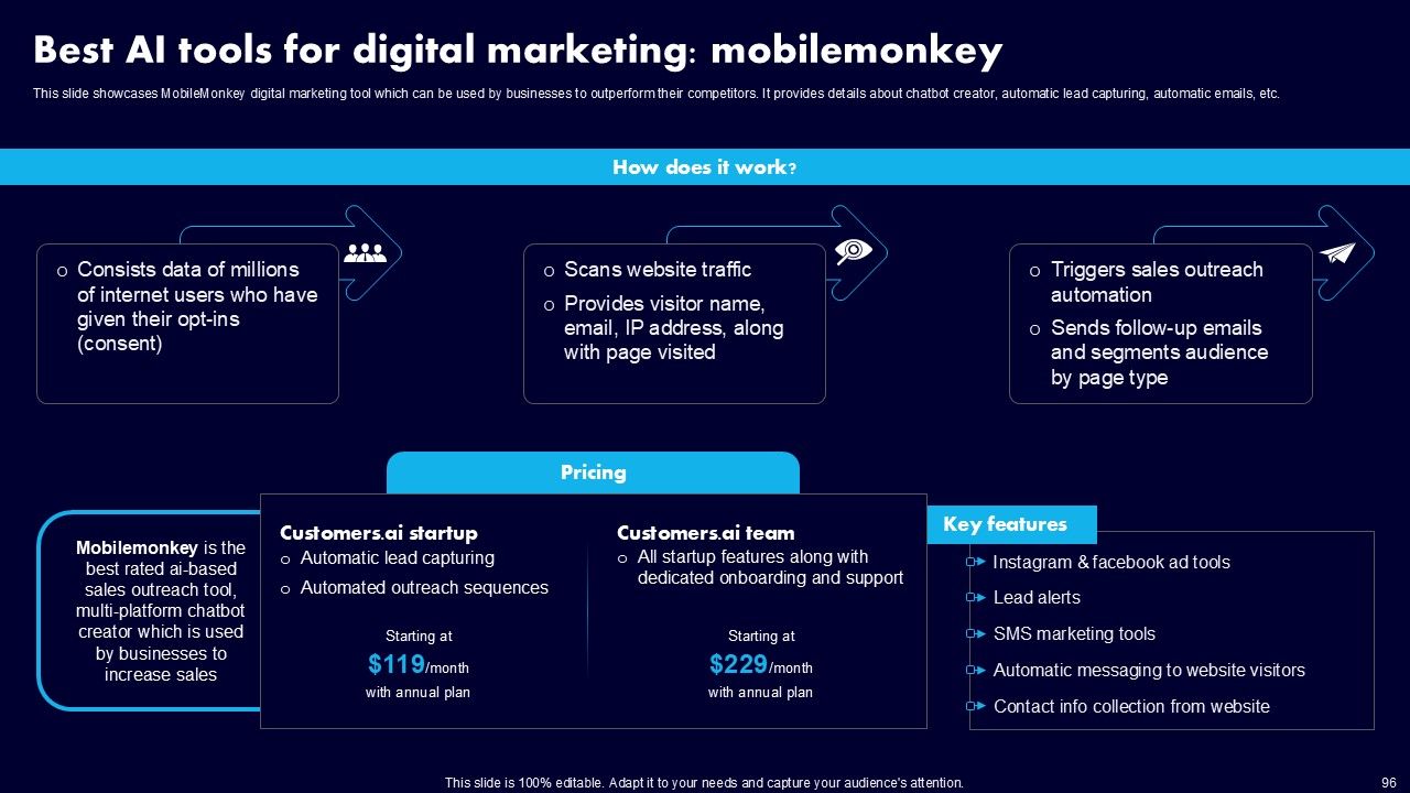 This AI Powered Advertising How To Get More Effective Results From Automation Ppt PowerPoint Presentation Complete Deck With Slides is a primer on how to capitalize on business opportunities through planning, innovation, and market intelligence. The content-ready format of the complete deck will make your job as a decision-maker a lot easier. Use this ready-made PowerPoint Template to help you outline an extensive and legible plan to capture markets and grow your company on the right path, at an exponential pace. What is even more amazing is that this presentation is completely editable and 100 percent customizable. This one hundred ninteen slide complete deck helps you impress a roomful of people with your expertise in business and even presentation. Craft such a professional and appealing presentation for that amazing recall value. Download now.