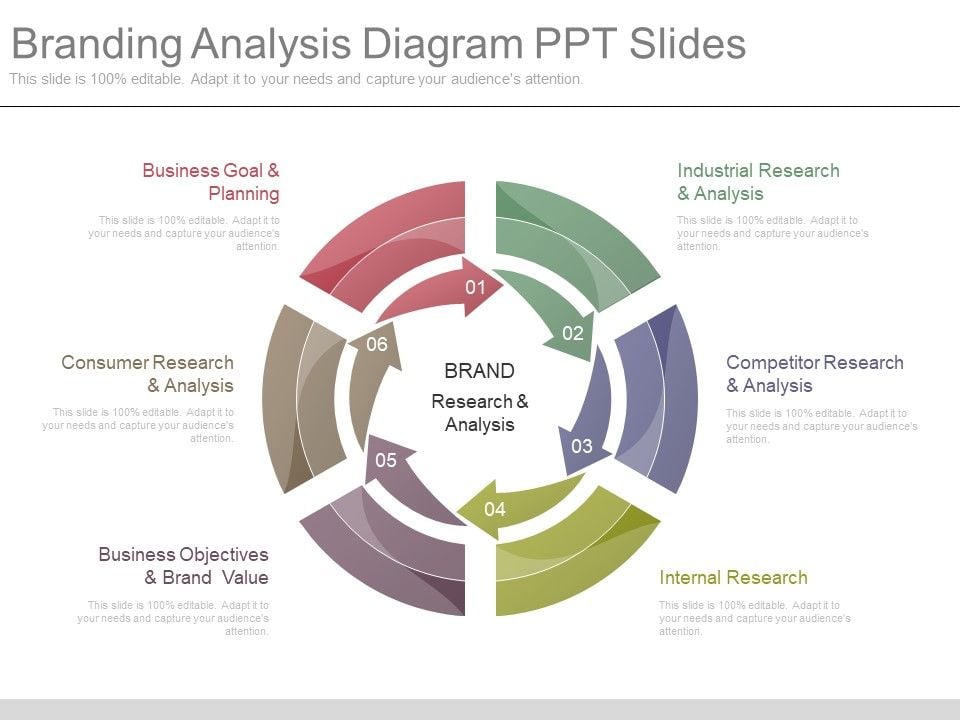 This is a branding analysis diagram ppt slides. This is a six stage process. The stages in this process are business goal and planning, industrial research and analysis, competitor research and analysis, internal research, business objectives and brand value, consumer research and analysis.