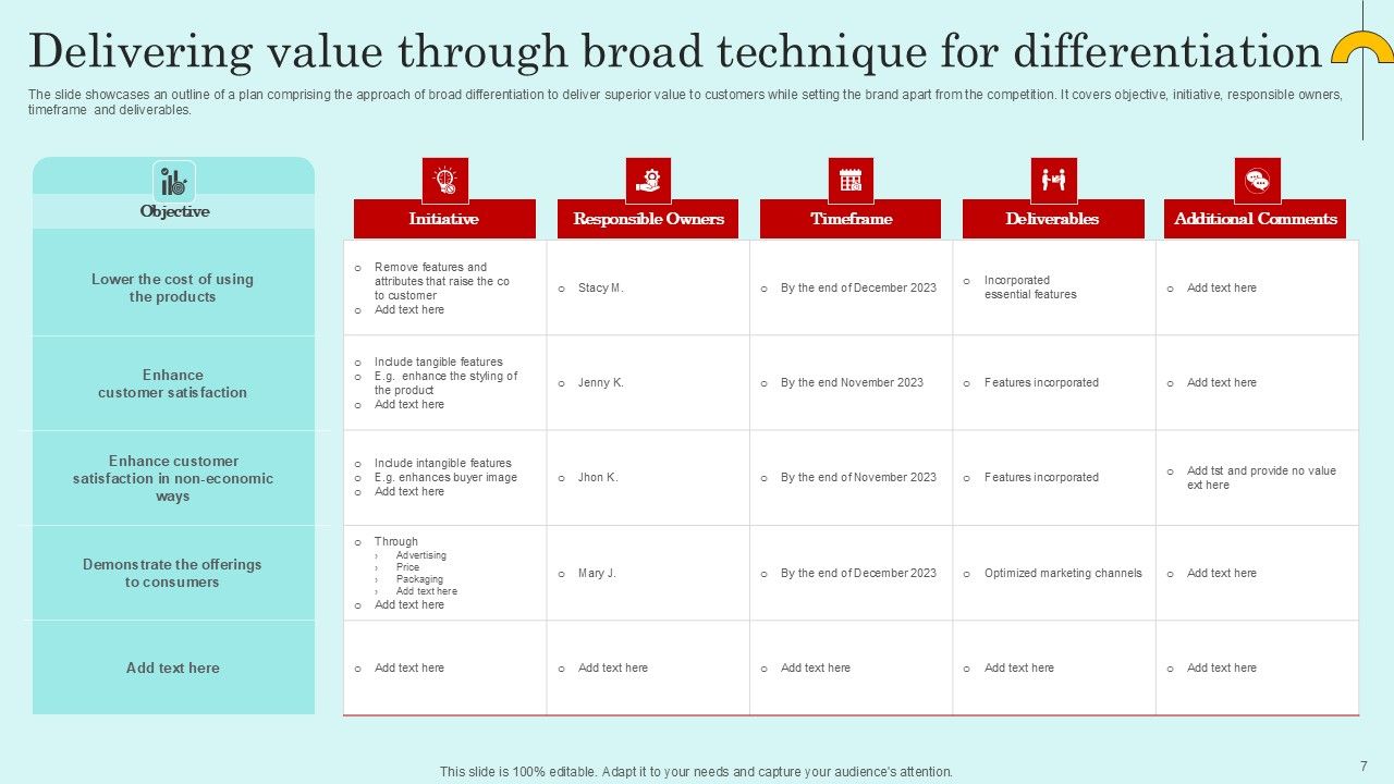 If designing a presentation takes a lot of your time and resources and you are looking for a better alternative, then this Broad Technique For Differentiation Ppt PowerPoint Presentation Complete Deck With Slides is the right fit for you. This is a prefabricated set that can help you deliver a great presentation on the topic. All the twelve slides included in this sample template can be used to present a birds-eye view of the topic. These slides are also fully editable, giving you enough freedom to add specific details to make this layout more suited to your business setting. Apart from the content, all other elements like color, design, theme are also replaceable and editable. This helps in designing a variety of presentations with a single layout. Not only this, you can use this PPT design in formats like PDF, PNG, and JPG once downloaded. Therefore, without any further ado, download and utilize this sample presentation as per your liking.