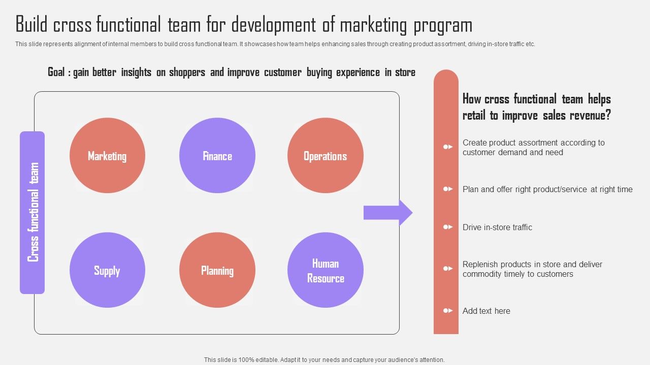 This slide represents alignment of internal members to build cross functional team. It showcases how team helps enhancing sales through creating product assortment, driving in-store traffic etc. This Build Cross Functional Team For Development Optimizing Customer Purchase Experience By Executing Formats PDF from Slidegeeks makes it easy to present information on your topic with precision. It provides customization options, so you can make changes to the colors, design, graphics, or any other component to create a unique layout. It is also available for immediate download, so you can begin using it right away. Slidegeeks has done good research to ensure that you have everything you need to make your presentation stand out. Make a name out there for a brilliant performance.