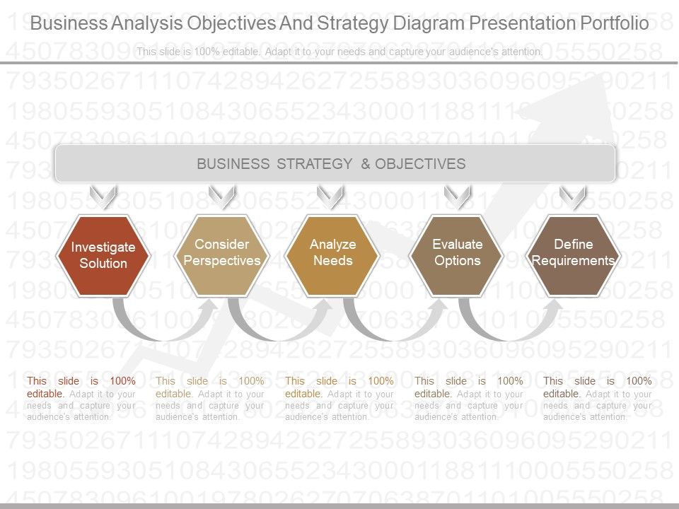 This is a business analysis objectives and strategy diagram presentation portfolio. This is a five stage process. The stages in this process are investigate solution, consider perspectives, analyze needs, evaluate options, define requirements.