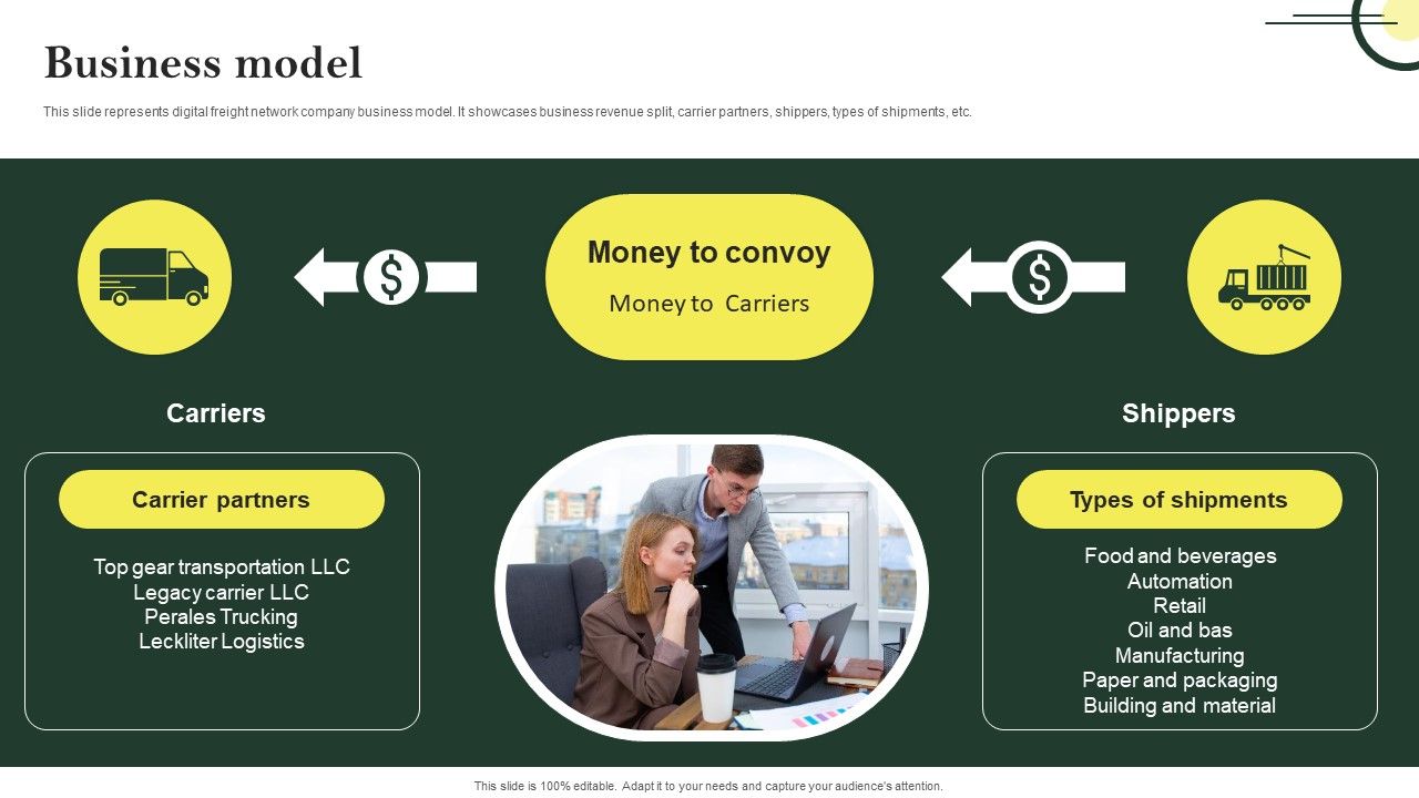 This slide represents digital freight network company business model. It showcases business revenue split, carrier partners, shippers, types of shipments, etc. Boost your pitch with our creative Business Model Logistic Company Investor Fund Raising Pitch Deck Pictures PDF. Deliver an awe-inspiring pitch that will mesmerize everyone. Using these presentation templates you will surely catch everyones attention. You can browse the ppts collection on our website. We have researchers who are experts at creating the right content for the templates. So you do not have to invest time in any additional work. Just grab the template now and use them.