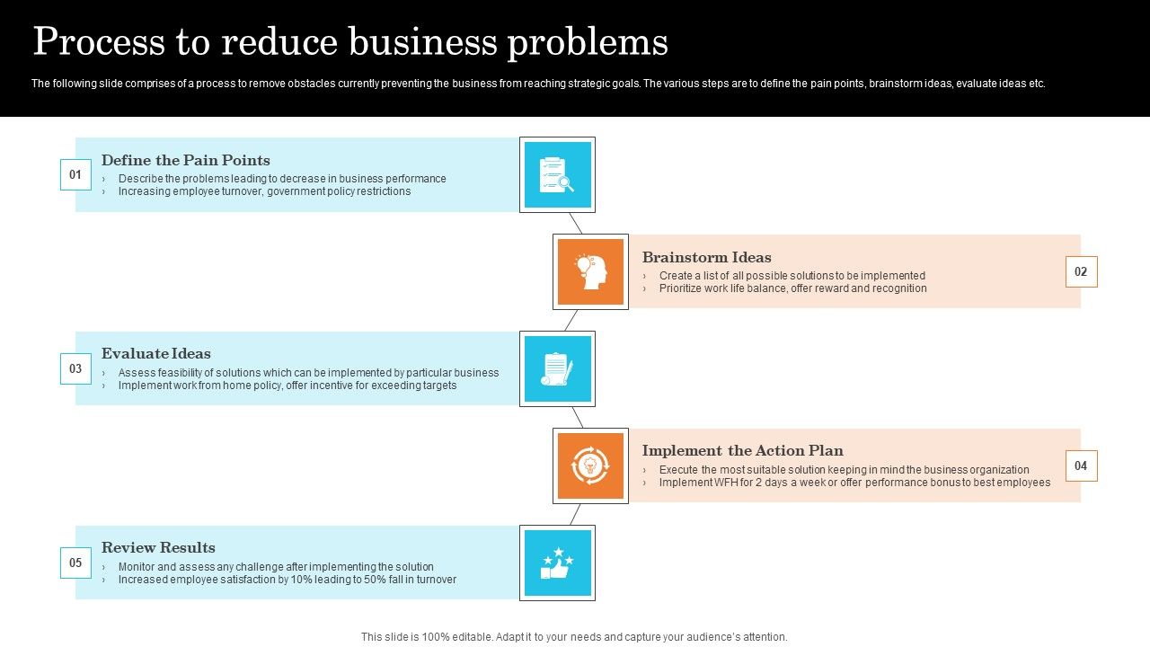 The following slide comprises of a process to remove obstacles currently preventing the business from reaching strategic goals. The various steps are to define the pain points, brainstorm ideas, evaluate ideas etc. Presenting Process To Reduce Business Problems Clipart PDF to dispense important information. This template comprises five stages. It also presents valuable insights into the topics including Brainstorm Ideas, Evaluate Ideas, Review Results. This is a completely customizable PowerPoint theme that can be put to use immediately. So, download it and address the topic impactfully.