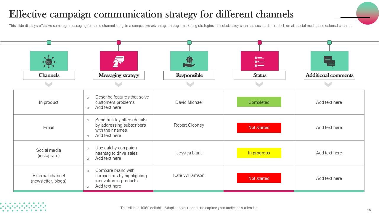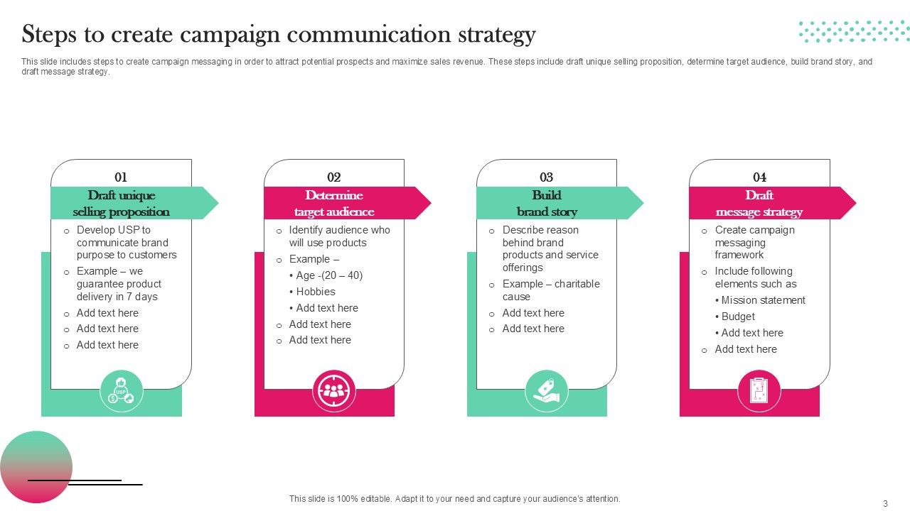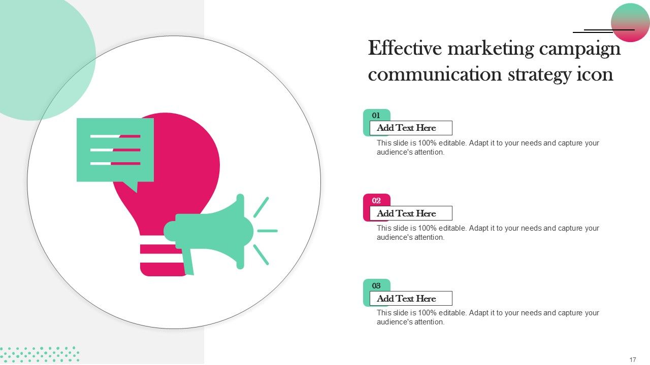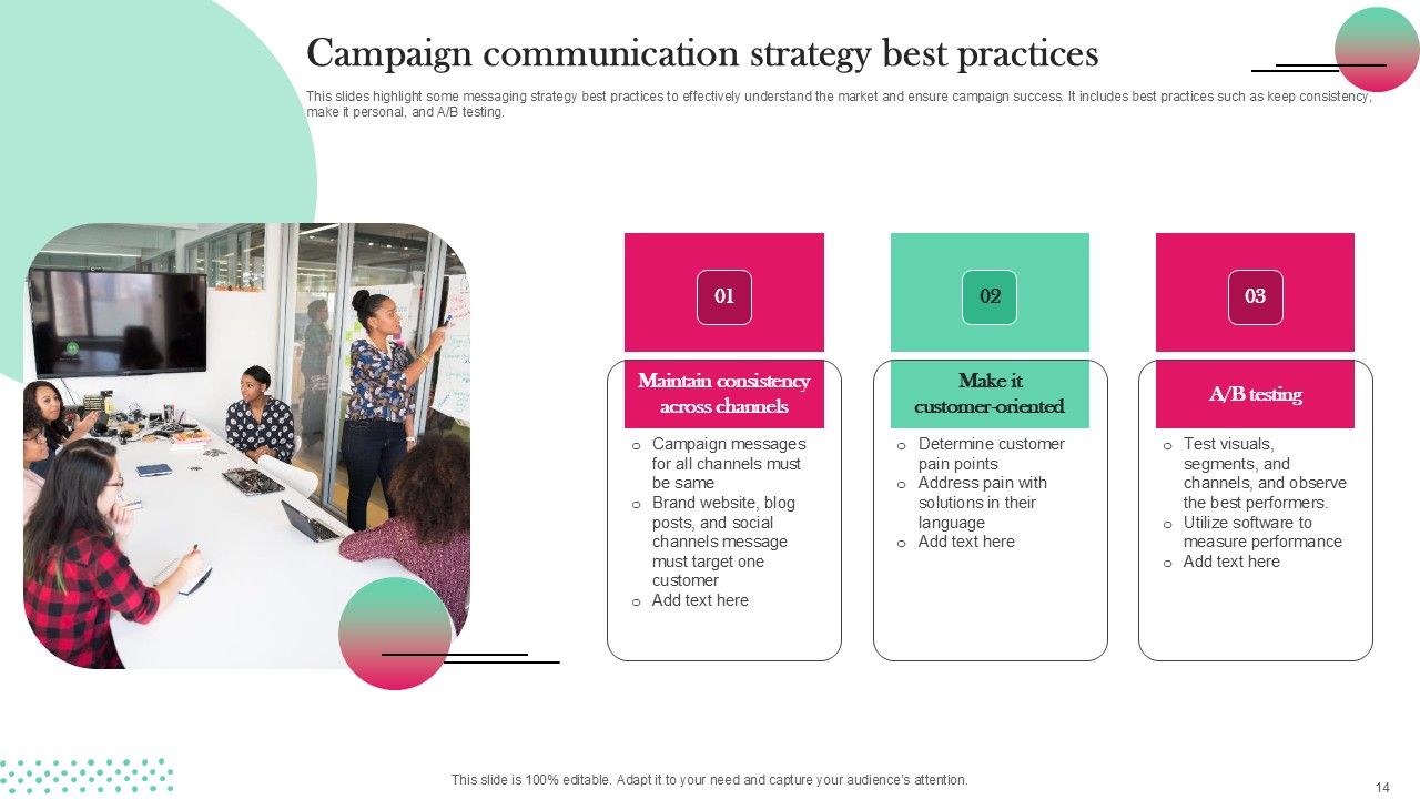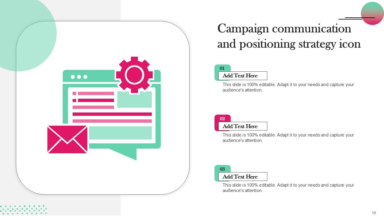 If designing a presentation takes a lot of your time and resources and you are looking for a better alternative, then this Campaign Communication Ppt PowerPoint Presentation Complete Deck With Slides is the right fit for you. This is a prefabricated set that can help you deliver a great presentation on the topic. All the twenty slides included in this sample template can be used to present a birds-eye view of the topic. These slides are also fully editable, giving you enough freedom to add specific details to make this layout more suited to your business setting. Apart from the content, all other elements like color, design, theme are also replaceable and editable. This helps in designing a variety of presentations with a single layout. Not only this, you can use this PPT design in formats like PDF, PNG, and JPG once downloaded. Therefore, without any further ado, download and utilize this sample presentation as per your liking.