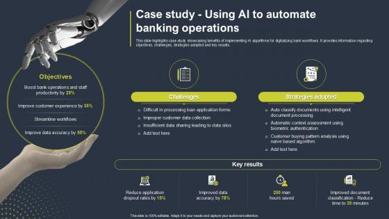 Slidegeeks has constructed Digitalising Customer Onboarding Case Study Using Ai To Automate Banking Operations after conducting extensive research and examination. These presentation templates are constantly being generated and modified based on user preferences and critiques from editors. Here, you will find the most attractive templates for a range of purposes while taking into account ratings and remarks from users regarding the content. This is an excellent jumping-off point to explore our content and will give new users an insight into our top-notch PowerPoint Templates.