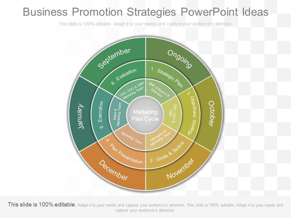 This is a business promotion strategies powerpoint ideas. This is a one stage process. The stages in this process are marketing plan cycle, cso, coo and cmo marketing team, sales and marketing team, marketing team, managers and marketing team, strategic plan, objectives strategy, goals and tactics, plan presentation, execution, evaluation, ongoing, october, november, december, january, september.