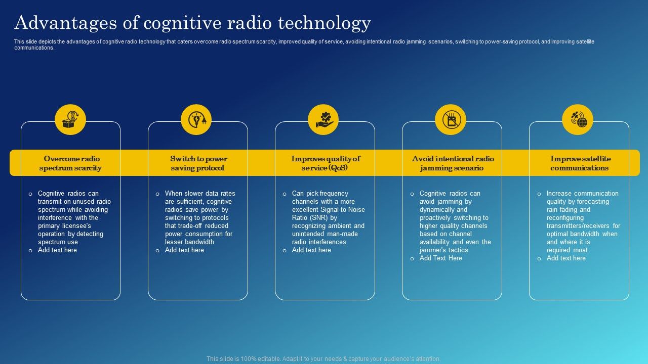 This slide depicts the advantages of cognitive radio technology that caters overcome radio spectrum scarcity, improved quality of service, avoiding intentional radio jamming scenarios, switching to power-saving protocol, and improving satellite communications. Get a simple yet stunning designed Cognitive Sensing Innovation Advantages Of Cognitive Radio Technology Brochure PDF. It is the best one to establish the tone in your meetings. It is an excellent way to make your presentations highly effective. So, download this PPT today from Slidegeeks and see the positive impacts. Our easy-to-edit Cognitive Sensing Innovation Advantages Of Cognitive Radio Technology Brochure PDF can be your go-to option for all upcoming conferences and meetings. So, what are you waiting for Grab this template today.