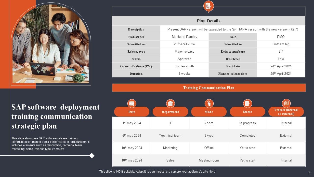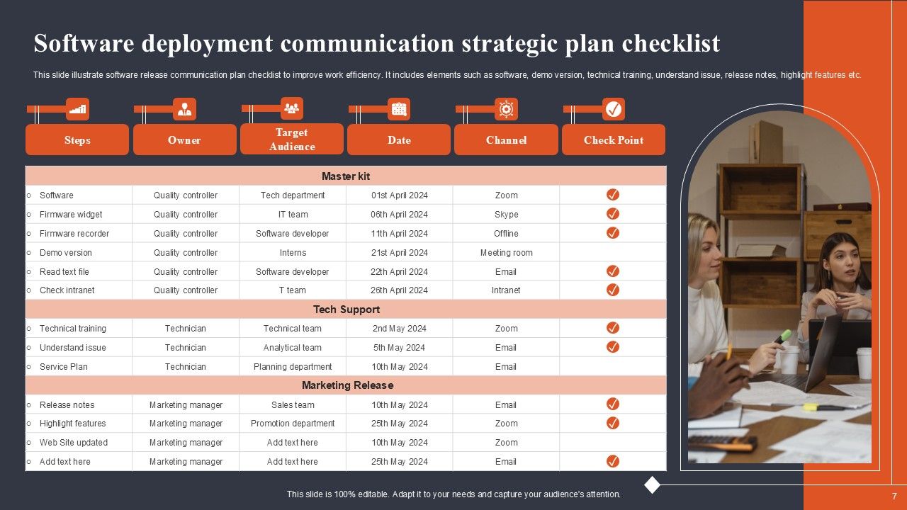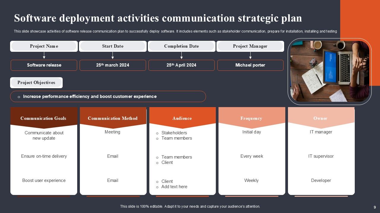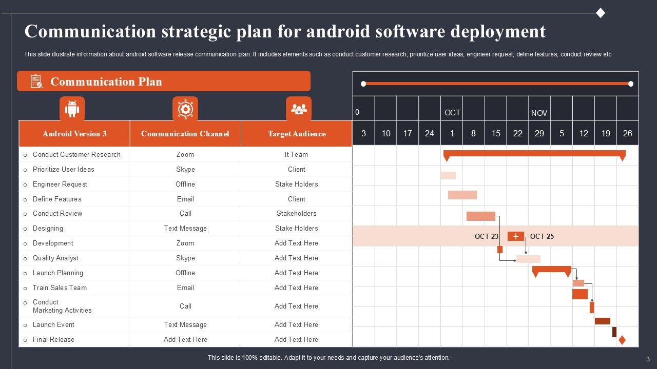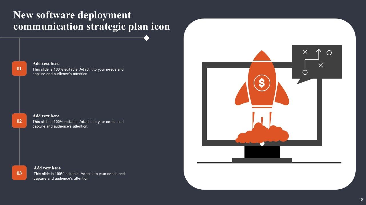 This Communication Strategic Plan For Software Deployment Ppt PowerPoint Presentation Complete Deck With Slides acts as backup support for your ideas, vision, thoughts, etc. Use it to present a thorough understanding of the topic. This PPT slideshow can be utilized for both in-house and outside presentations depending upon your needs and business demands. Entailing twelve slides with a consistent design and theme, this template will make a solid use case. As it is intuitively designed, it suits every business vertical and industry. All you have to do is make a few tweaks in the content or any other component to design unique presentations. The biggest advantage of this complete deck is that it can be personalized multiple times once downloaded. The color, design, shapes, and other elements are free to modify to add personal touches. You can also insert your logo design in this PPT layout. Therefore a well-thought and crafted presentation can be delivered with ease and precision by downloading this Communication Strategic Plan For Software Deployment Ppt PowerPoint Presentation Complete Deck With Slides PPT slideshow.