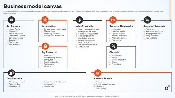 Following slide provided detailed insights into companies business model which comprises of key partners, key activities, resources, value proposition, customer relations, channels, customer segment, cost structure, and revenue sources. Create an editable Business Model Canvas Hero Bike Company Profile CP SS V that communicates your idea and engages your audience. Whether you are presenting a business or an educational presentation, pre-designed presentation templates help save time. Business Model Canvas Hero Bike Company Profile CP SS V is highly customizable and very easy to edit, covering many different styles from creative to business presentations. Slidegeeks has creative team members who have crafted amazing templates. So, go and get them without any delay. Following slide provided detailed insights into companies business model which comprises of key partners, key activities, resources, value proposition, customer relations, channels, customer segment, cost structure, and revenue sources.