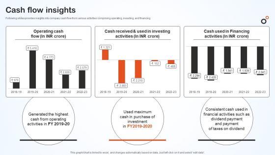 Following slides provides insights into company cash flow from various activities comprising operating, investing, and financing. Want to ace your presentation in front of a live audience Our Cash Flow Insights Hero Bike Company Profile CP SS V can help you do that by engaging all the users towards you. Slidegeeks experts have put their efforts and expertise into creating these impeccable powerpoint presentations so that you can communicate your ideas clearly. Moreover, all the templates are customizable, and easy-to-edit and downloadable. Use these for both personal and commercial use. Following slides provides insights into company cash flow from various activities comprising operating, investing, and financing.