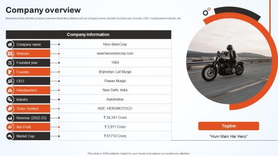 Mentioned slide exhibits company overview illustrating details such as company name, website, founded year, founder, CEO, headquarters Industry, etc. There are so many reasons you need a Company Overview Hero Bike Company Profile CP SS V. The first reason is you can not spend time making everything from scratch, Thus, Slidegeeks has made presentation templates for you too. You can easily download these templates from our website easily. Mentioned slide exhibits company overview illustrating details such as company name, website, founded year, founder, CEO, headquarters Industry, etc.