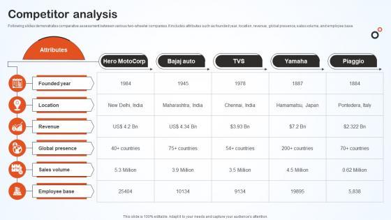 Following slides demonstrates comparative assessment between various two-wheeler companies. It includes attributes such as founded year, location, revenue, global presence, sales volume, and employee base. Do you have to make sure that everyone on your team knows about any specific topic I yes, then you should give Competitor Analysis Hero Bike Company Profile CP SS V a try. Our experts have put a lot of knowledge and effort into creating this impeccable Competitor Analysis Hero Bike Company Profile CP SS V. You can use this template for your upcoming presentations, as the slides are perfect to represent even the tiniest detail. You can download these templates from the Slidegeeks website and these are easy to edit. So grab these today Following slides demonstrates comparative assessment between various two-wheeler companies. It includes attributes such as founded year, location, revenue, global presence, sales volume, and employee base.