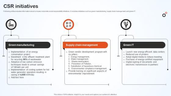 Following slides includes information about company corporate social responsibility initiatives. It includes initiatives such as green manufacturing, supply chain management, and green IT. Slidegeeks is here to make your presentations a breeze with Csr Initiatives Hero Bike Company Profile CP SS V With our easy-to-use and customizable templates, you can focus on delivering your ideas rather than worrying about formatting. With a variety of designs to choose from, you are sure to find one that suits your needs. And with animations and unique photos, illustrations, and fonts, you can make your presentation pop. So whether you are giving a sales pitch or presenting to the board, make sure to check out Slidegeeks first Following slides includes information about company corporate social responsibility initiatives. It includes initiatives such as green manufacturing, supply chain management, and green IT.
