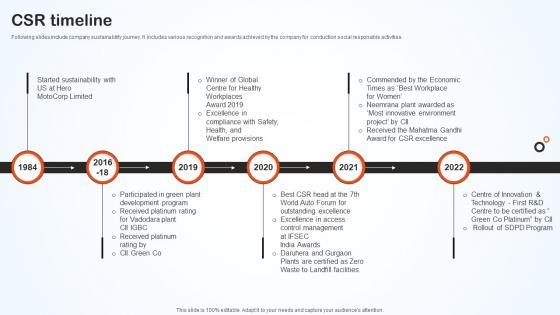 Following slides include company sustainability journey. It includes various recognition and awards achieved by the company for conduction social responsible activities. Whether you have daily or monthly meetings, a brilliant presentation is necessary. Csr Timeline Hero Bike Company Profile CP SS V can be your best option for delivering a presentation. Represent everything in detail using Csr Timeline Hero Bike Company Profile CP SS V and make yourself stand out in meetings. The template is versatile and follows a structure that will cater to your requirements. All the templates prepared by Slidegeeks are easy to download and edit. Our research experts have taken care of the corporate themes as well. So, give it a try and see the results. Following slides include company sustainability journey. It includes various recognition and awards achieved by the company for conduction social responsible activities.