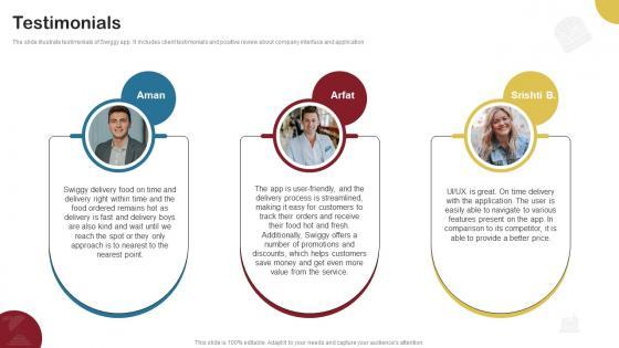 The slide illustrate testimonials of Swiggy app. It includes client testimonials and positive review about company interface and application. There are so many reasons you need a Testimonials Food Delivery Company Profile CP SS V. The first reason is you can not spend time making everything from scratch, Thus, Slidegeeks has made presentation templates for you too. You can easily download these templates from our website easily. The slide illustrate testimonials of Swiggy app. It includes client testimonials and positive review about company interface and application.