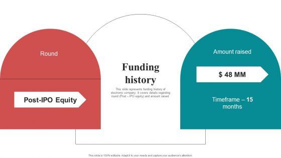 This slide represents funding history of electronic company. It covers details regarding round Post IPO equity and amount raised. Coming up with a presentation necessitates that the majority of the effort goes into the content and the message you intend to convey. The visuals of a PowerPoint presentation can only be effective if it supplements and supports the story that is being told. Keeping this in mind our experts created Funding History Mobile Electronics Fund Raising Pitch Deck Rules PDF to reduce the time that goes into designing the presentation. This way, you can concentrate on the message while our designers take care of providing you with the right template for the situation.
