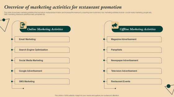 This slide showcases marketing activities that can help in restaurant promotion and increase the revenue by acquiring new customers. Key marketing activities include - social media marketing, google ads,SMS marketing, television advertisement, pamphlets etc. Are you searching for a Coffeehouse Promotion Techniques To Boost Revenue Overview Of Marketing Activities Restaurant Topics PDF that is uncluttered, straightforward, and original Its easy to edit, and you can change the colors to suit your personal or business branding. For a presentation that expresses how much effort you have put in, this template is ideal With all of its features, including tables, diagrams, statistics, and lists, its perfect for a business plan presentation. Make your ideas more appealing with these professional slides. Download Coffeehouse Promotion Techniques To Boost Revenue Overview Of Marketing Activities Restaurant Topics PDF from Slidegeeks today.