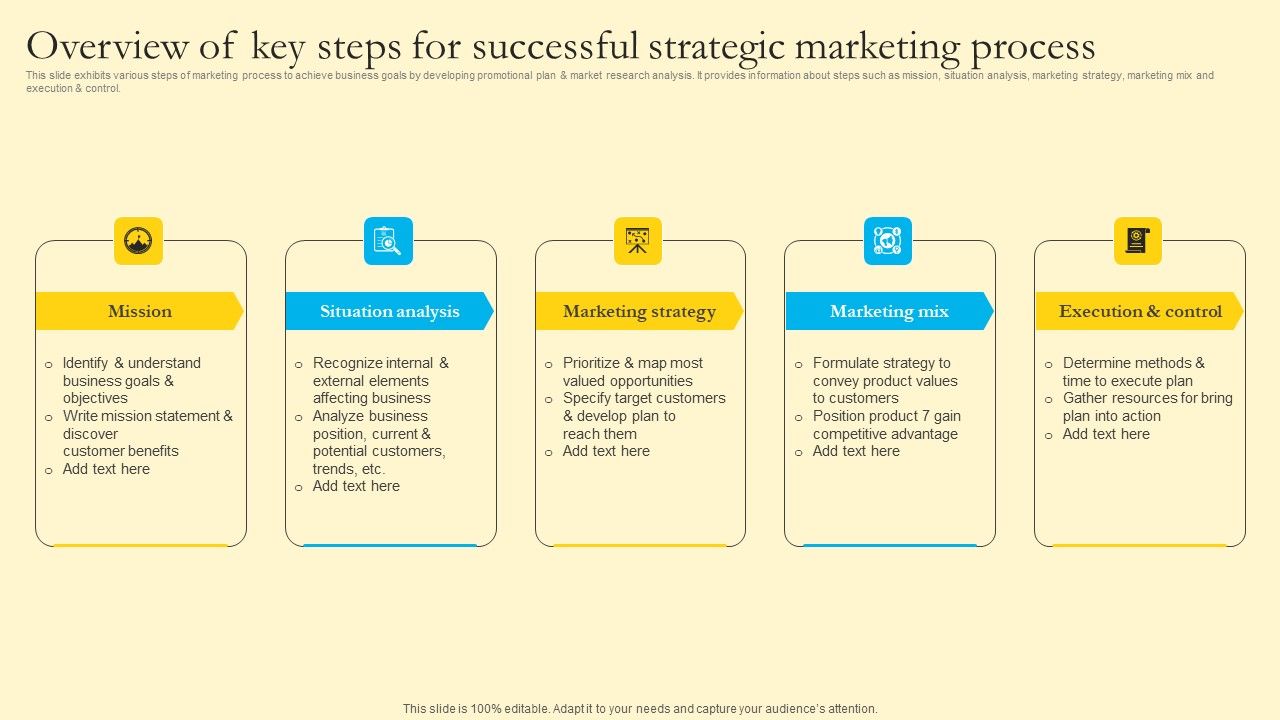 This slide exhibits various steps of marketing process to achieve business goals by developing promotional plan and market research analysis. It provides information about steps such as mission, situation analysis, marketing strategy, marketing mix and execution and control. This modern and well-arranged Comprehensive Guide For Sales And Advertising Processes Overview Of Key Steps For Successful Strategic Graphics PDF provides lots of creative possibilities. It is very simple to customize and edit with the Powerpoint Software. Just drag and drop your pictures into the shapes. All facets of this template can be edited with Powerpoint, no extra software is necessary. Add your own material, put your images in the places assigned for them, adjust the colors, and then you can show your slides to the world, with an animated slide included.