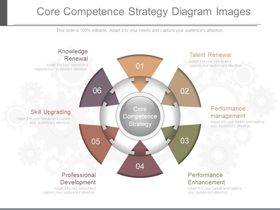 This is a core competence strategy diagram images. This is a six stage process. The stages in this process are talent renewal, performance management, performance enhancement, professional development, skill upgrading, knowledge renewal.