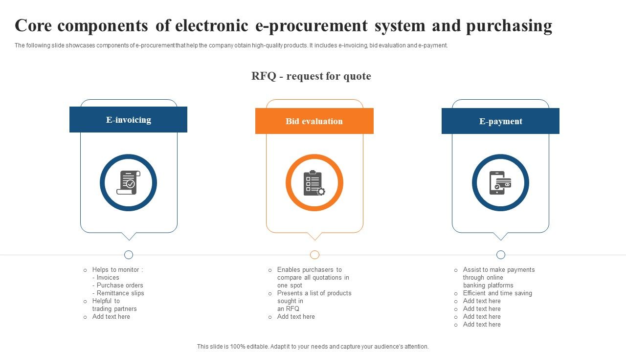 The following slide showcases components of e procurement that help the company obtain high quality products. It includes e invoicing, bid evaluation and e payment. Persuade your audience using this Core Components Of Electronic E Procurement System And Purchasing Rules PDF. This PPT design covers three stages, thus making it a great tool to use. It also caters to a variety of topics including Bid Evaluation, E Payment, E Invoicing. Download this PPT design now to present a convincing pitch that not only emphasizes the topic but also showcases your presentation skills.
