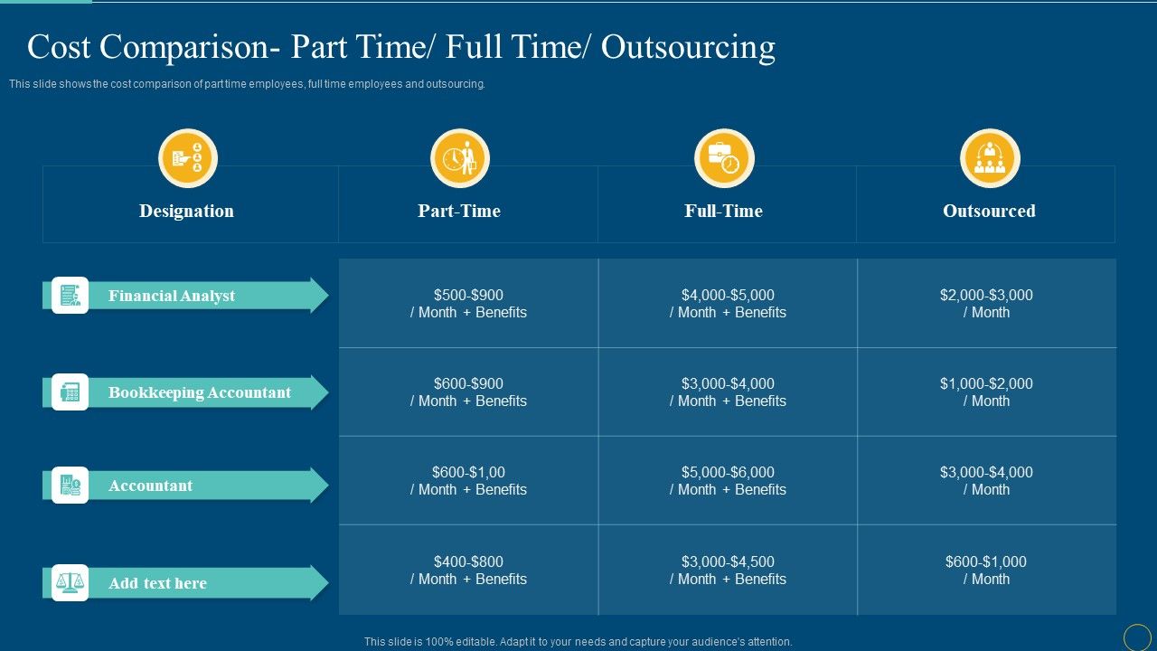 This slide shows the cost comparison of part time employees, full time employees and outsourcing.Deliver and pitch your topic in the best possible manner with this cost comparison part time full time outsourcing guidelines pdf Use them to share invaluable insights on financial analyst, bookkeeping accountant, accountant and impress your audience. This template can be altered and modified as per your expectations. So, grab it now.
