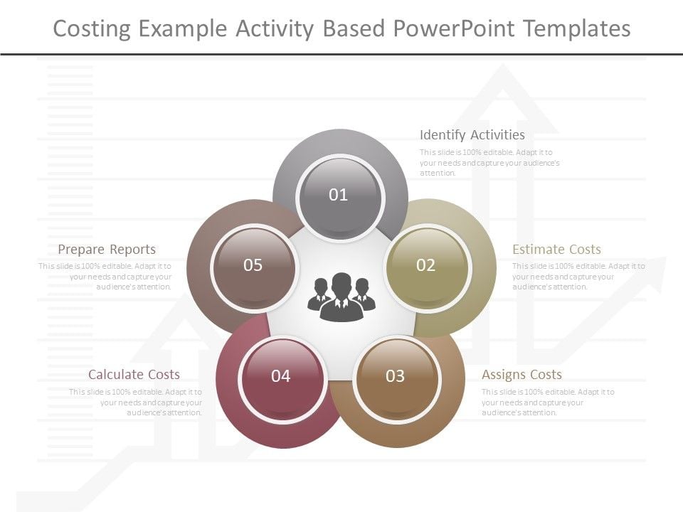 This is a costing example activity based powerpoint templates. This is a five stage process. The stages in this process are identify activities, estimate costs, assigns costs, calculate costs, prepare reports.