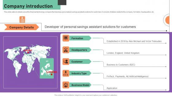 This slide caters to details about the financial technology company that develops personalized savings assistant solutions for customers. It consists of details related to the company, formation, headquarters, etc. Slidegeeks is one of the best resources for PowerPoint templates. You can download easily and regulate Company Introduction Financial Management Software Capital Raising Deck Topics Pdf for your personal presentations from our wonderful collection. A few clicks is all it takes to discover and get the most relevant and appropriate templates. Use our Templates to add a unique zing and appeal to your presentation and meetings. All the slides are easy to edit and you can use them even for advertisement purposes.