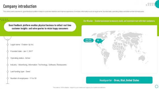 This slide covers overview to guest feedback platform helps in customer retention and improve experience. It involves information such as legal name, founded date, operating status and total number of employees. Make sure to capture your audiences attention in your business displays with our gratis customizable Company Introduction Ovation Capital Funding Pitch Deck Summary Pdf. These are great for business strategies, office conferences, capital raising or task suggestions. If you desire to acquire more customers for your tech business and ensure they stay satisfied, create your own sales presentation with these plain slides.