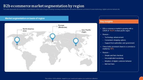 This slide represents b2b ecommerce market division on the basis of region enabling marketing understand the demand for electronic commerce. It covers technology, digital customer behavior etc. Coming up with a presentation necessitates that the majority of the effort goes into the content and the message you intend to convey. The visuals of a PowerPoint presentation can only be effective if it supplements and supports the story that is being told. Keeping this in mind our experts created Digital Platform Administration For Digital Platform Administration For B2B Ecommerce Sample Pdf to reduce the time that goes into designing the presentation. This way, you can concentrate on the message while our designers take care of providing you with the right template for the situation.