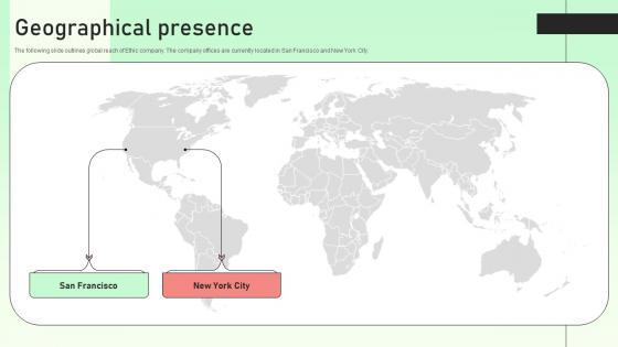 The following slide outlines global reach of Ethic company. The company offices are currently located in San Francisco and New York City. Whether you have daily or monthly meetings, a brilliant presentation is necessary. Geographical Presence Value Based Investor Financing Pitch Deck Download Pdf can be your best option for delivering a presentation. Represent everything in detail using Geographical Presence Value Based Investor Financing Pitch Deck Download Pdf and make yourself stand out in meetings. The template is versatile and follows a structure that will cater to your requirements. All the templates prepared by Slidegeeks are easy to download and edit. Our research experts have taken care of the corporate themes as well. So, give it a try and see the results.