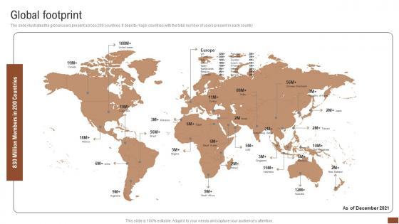 The slide illustrates the global users present across 200 countries. It depicts major countries with the total number of users present in each country There are so many reasons you need a Global Footprint Talent Recruitment Company Outline Mockup Pdf. The first reason is you can not spend time making everything from scratch, Thus, Slidegeeks has made presentation templates for you too. You can easily download these templates from our website easily.