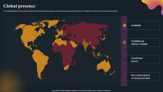 The slide illustrates the international reach of Disney plus streaming services. It showcases presence of Disney plus OTT platform services in 106 countries across globe. If your project calls for a presentation, then Slidegeeks is your go-to partner because we have professionally designed, easy-to-edit templates that are perfect for any presentation. After downloading, you can easily edit Global Presence OTT Platform Company Outline Download Pdf and make the changes accordingly. You can rearrange slides or fill them with different images. Check out all the handy templates