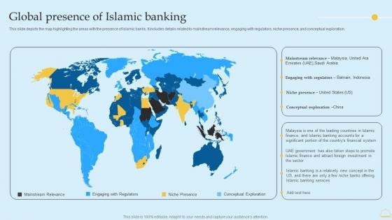 This slide depicts the map highlighting the areas with the presence of Islamic banks. It includes details related to mainstream relevance, engaging with regulators, niche presence, and conceptual exploration. Welcome to our selection of the In Depth Analysis Of Islamic Banking Global Presence Of Islamic Banking Download PDF. These are designed to help you showcase your creativity and bring your sphere to life. Planning and Innovation are essential for any business that is just starting out. This collection contains the designs that you need for your everyday presentations. All of our PowerPoints are 100 percent editable, so you can customize them to suit your needs. This multi-purpose template can be used in various situations. Grab these presentation templates today.